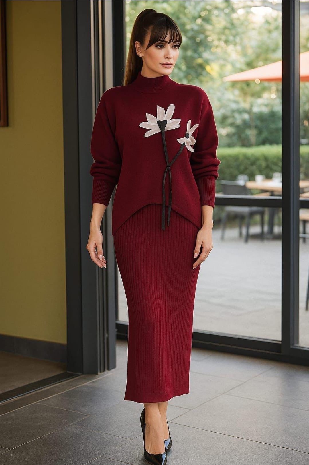 Setul este alcătuit dintr-un pulover lejer cu guler la baza gâtului, decorat cu aplicații florale 3D contrastante, și o rochie midi mulată, care evidențiază elegant silueta.