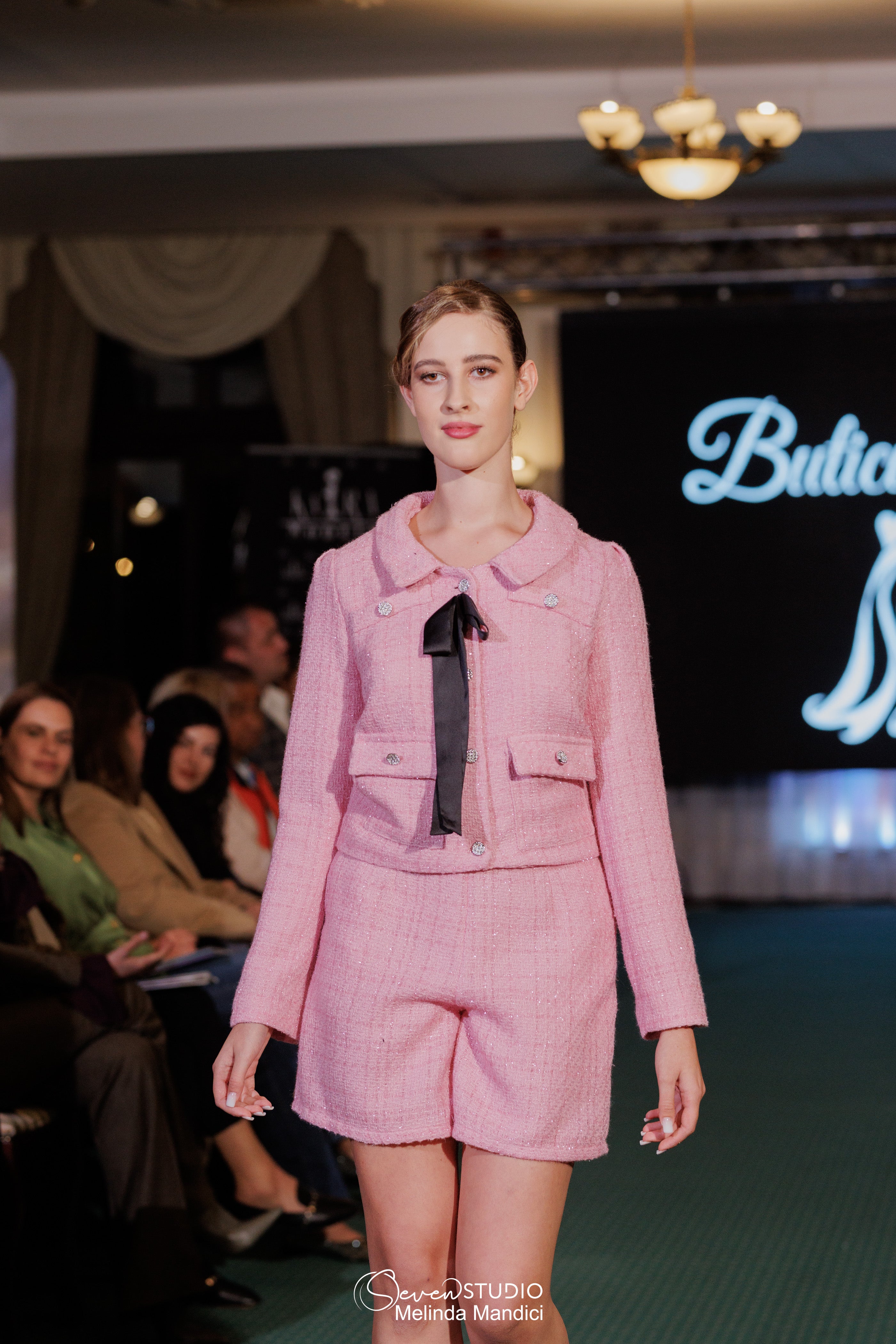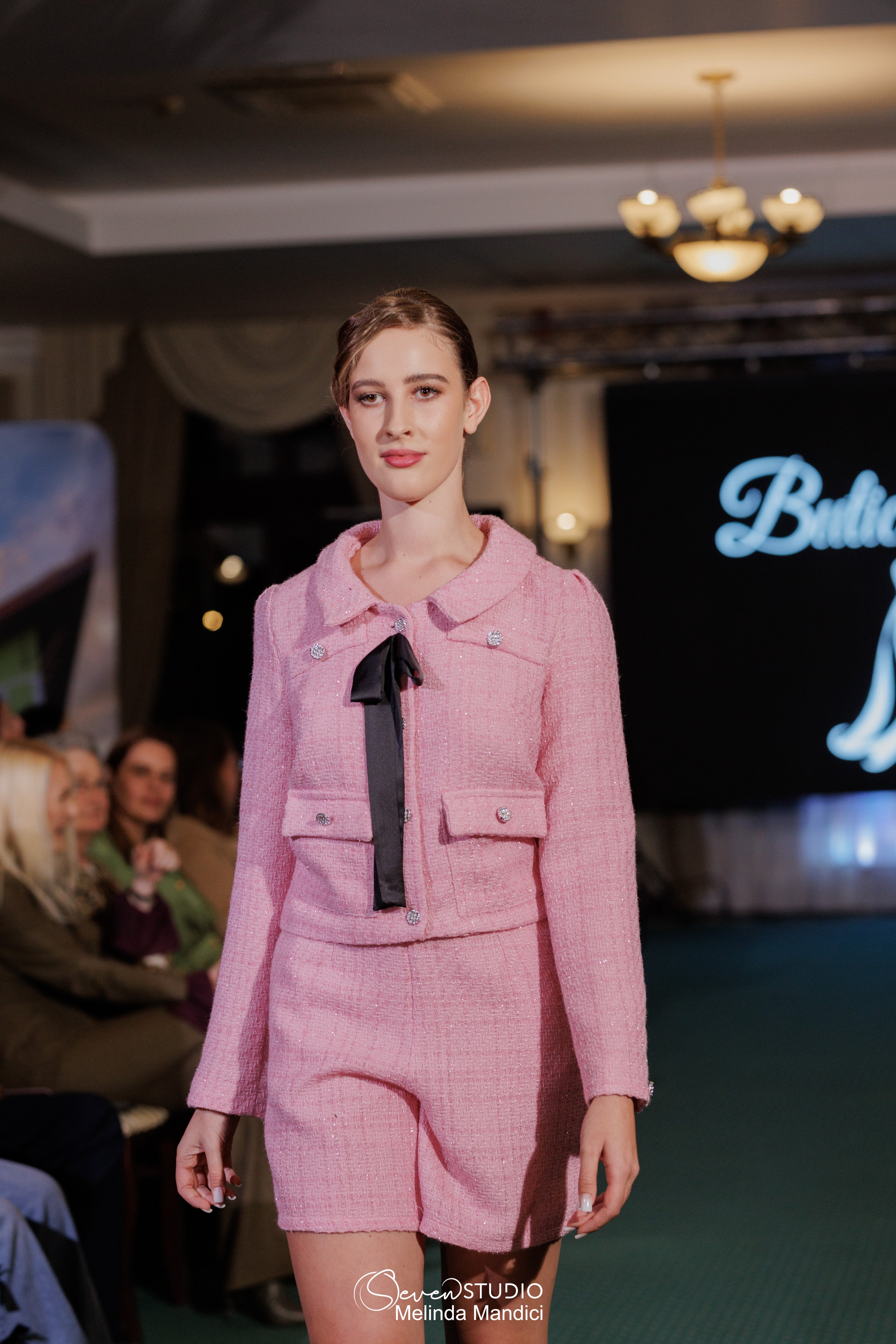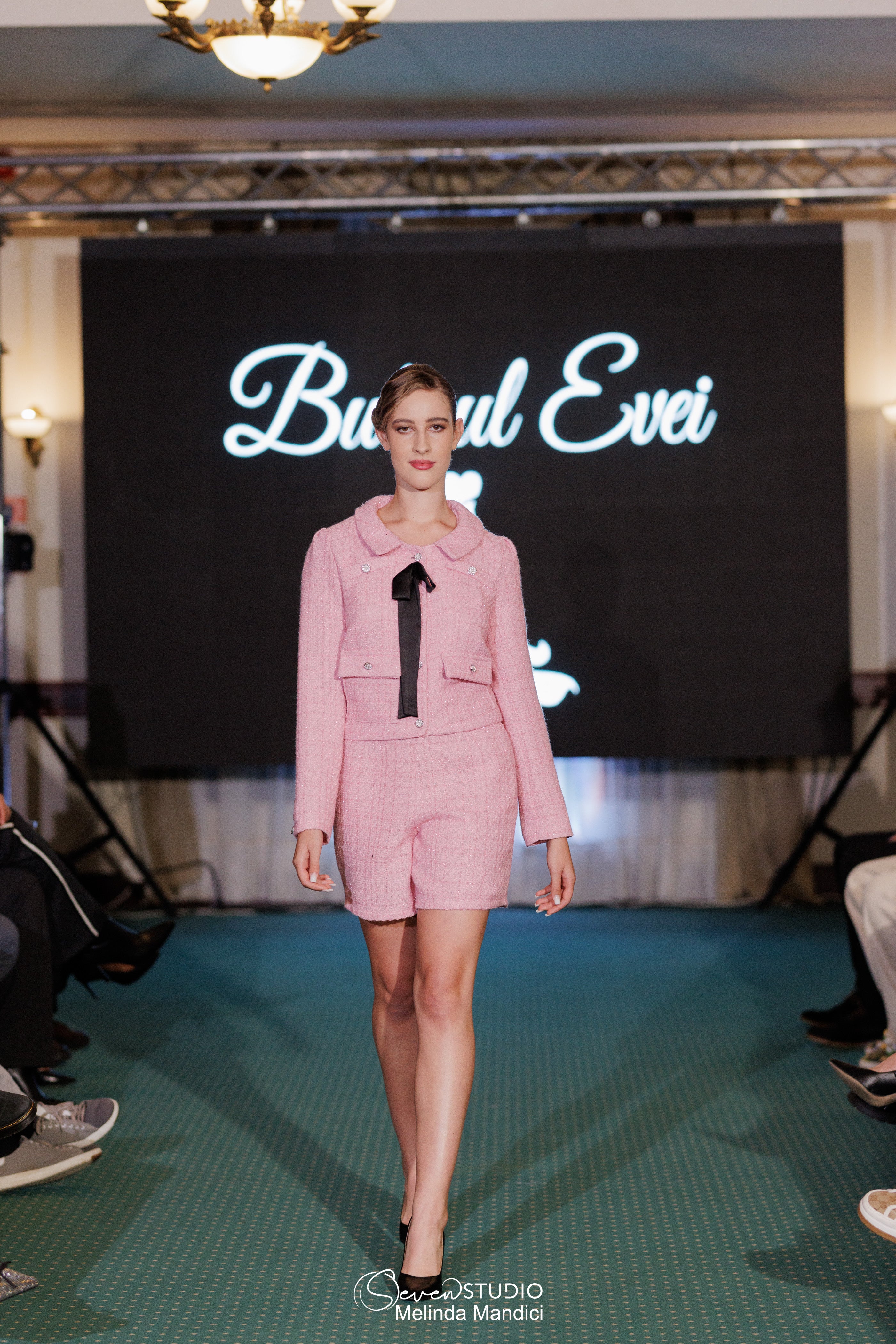 Вталената яке, с фини детайли и декоративни копчета, перфектно допълва шортите с висока талия, предлагайки безупречен тоалет.