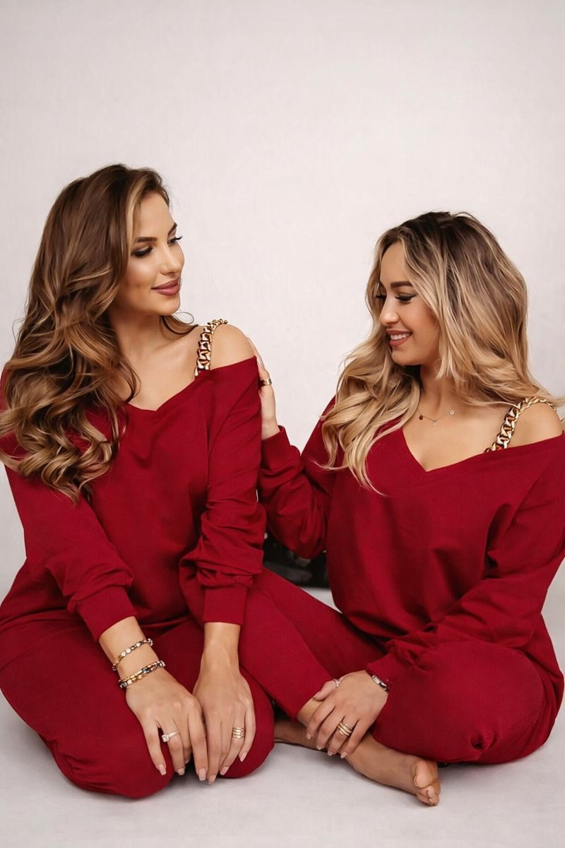 Коледният анцуг е много удобен, допълнен с верижка на едното рамо и V-образно деколте на блузата. Идеален за този сезон. Анцугът е част от премиум колекцията на Buticul Evei. Анцуг от две части, изработен от кадифе. Свободна блуза, без система за закопчаване.