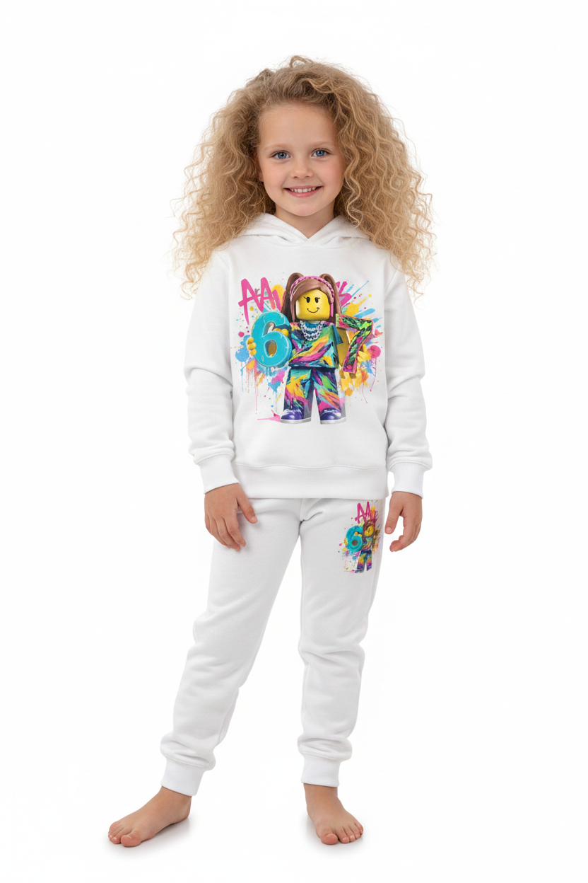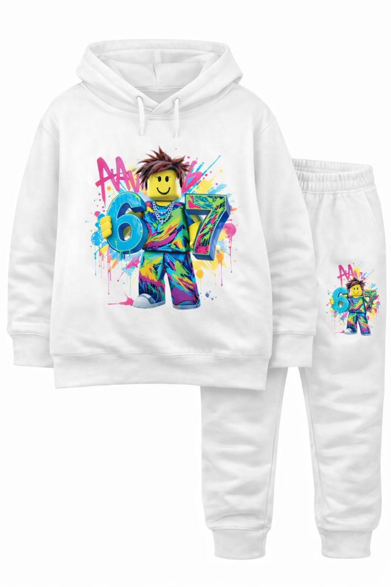 Set modern pentru copii, realizat din material moale și confortabil, ideal pentru activitățile zilnice. Hanoracul cu glugă și pantalonii asortați sunt personalizați cu un print colorat „SIX SEVEN”, inspirat din universul preferat al celor mici, un design vesel și plin de energie, adorat de copii.
