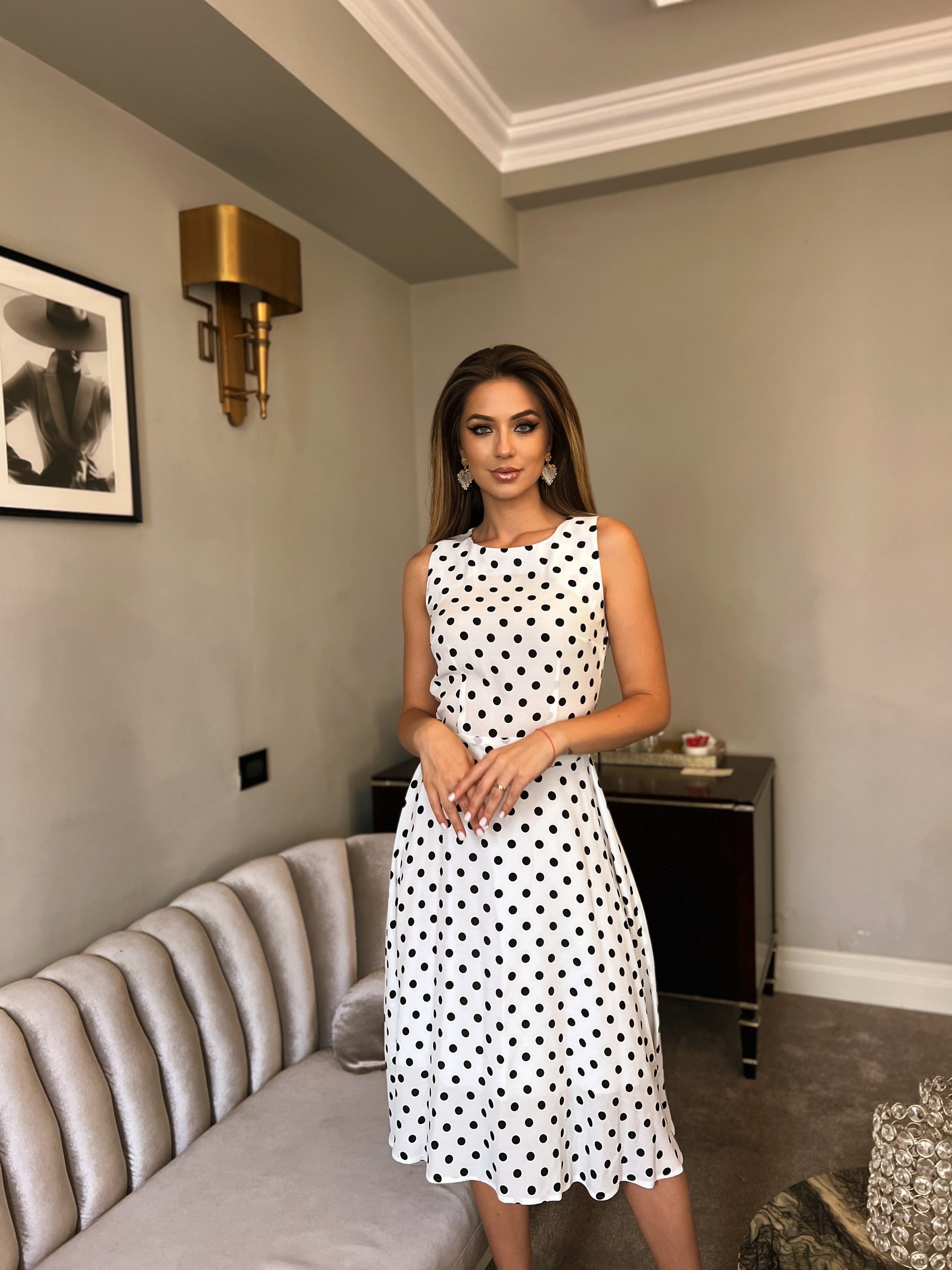 Adoptă farmecul clasic al anilor ‘50 cu această superbă rochie midi albă cu buline negre. Confecționată dintr-un material lejer și fluid, rochia urmărește delicat linia corpului și evidențiază talia, oferind o siluetă feminină și rafinată.
