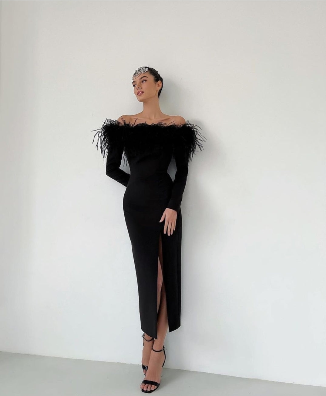 • Accesorizata cu pene de strut aplicate pe partea din fata a rochiei.