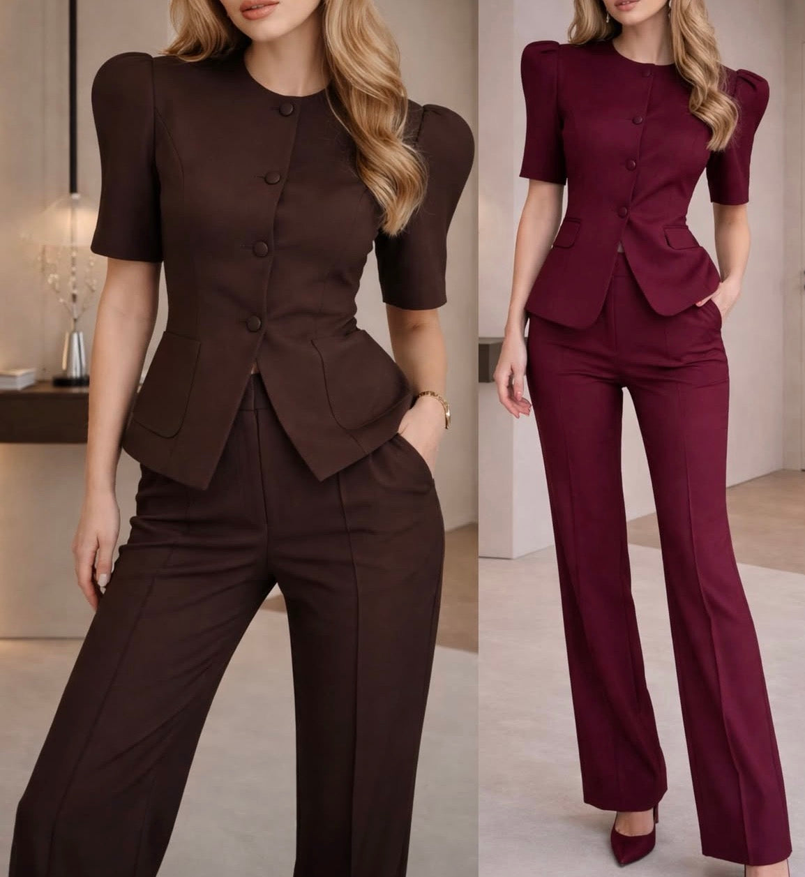 Sacoul cu mâneci scurte și umeri structurați creează o siluetă armonioasă, iar nasturii frontali și buzunarele decorative adaugă un plus de rafinament. Pantalonii au croială dreaptă, ușor evazată, pentru un efect de alungire și eleganță.