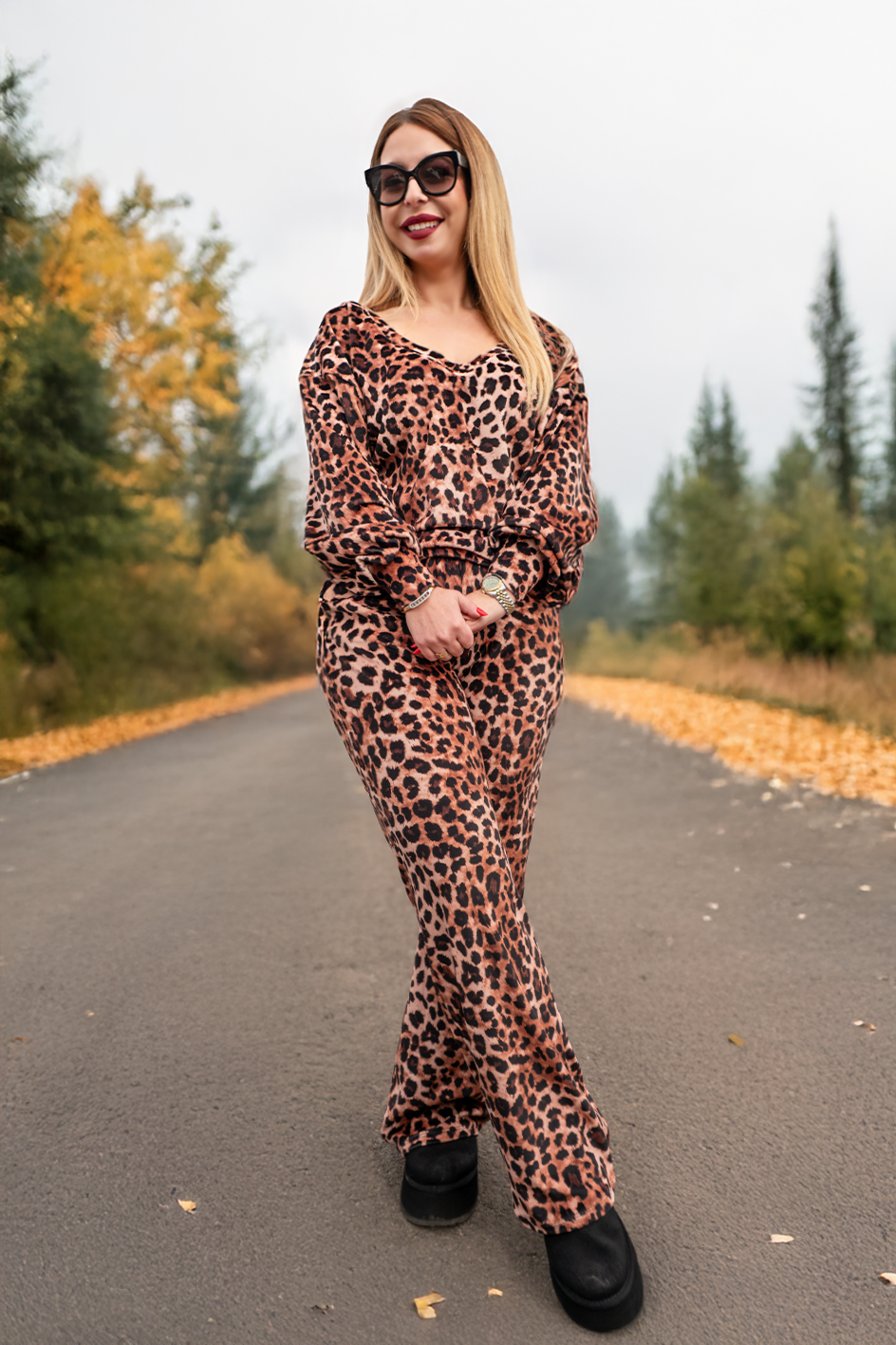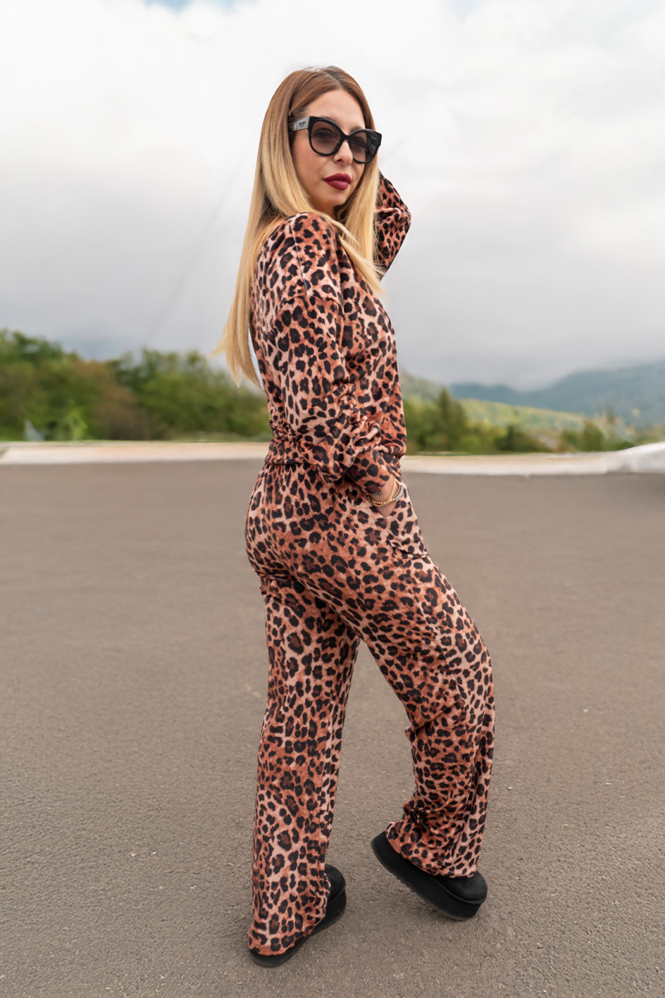 • Compus din doua piese : pantalon evazat si bluză reversibila!