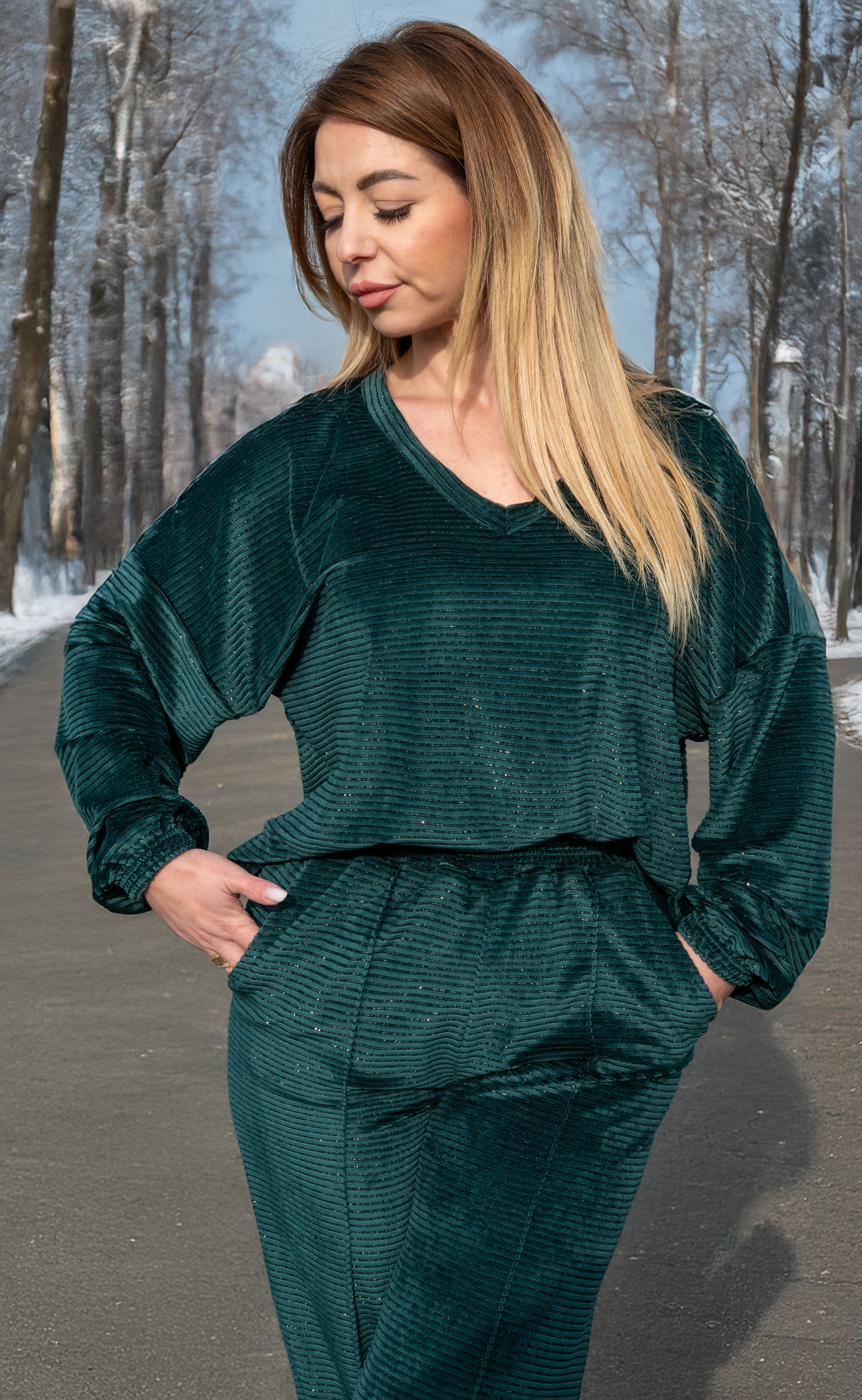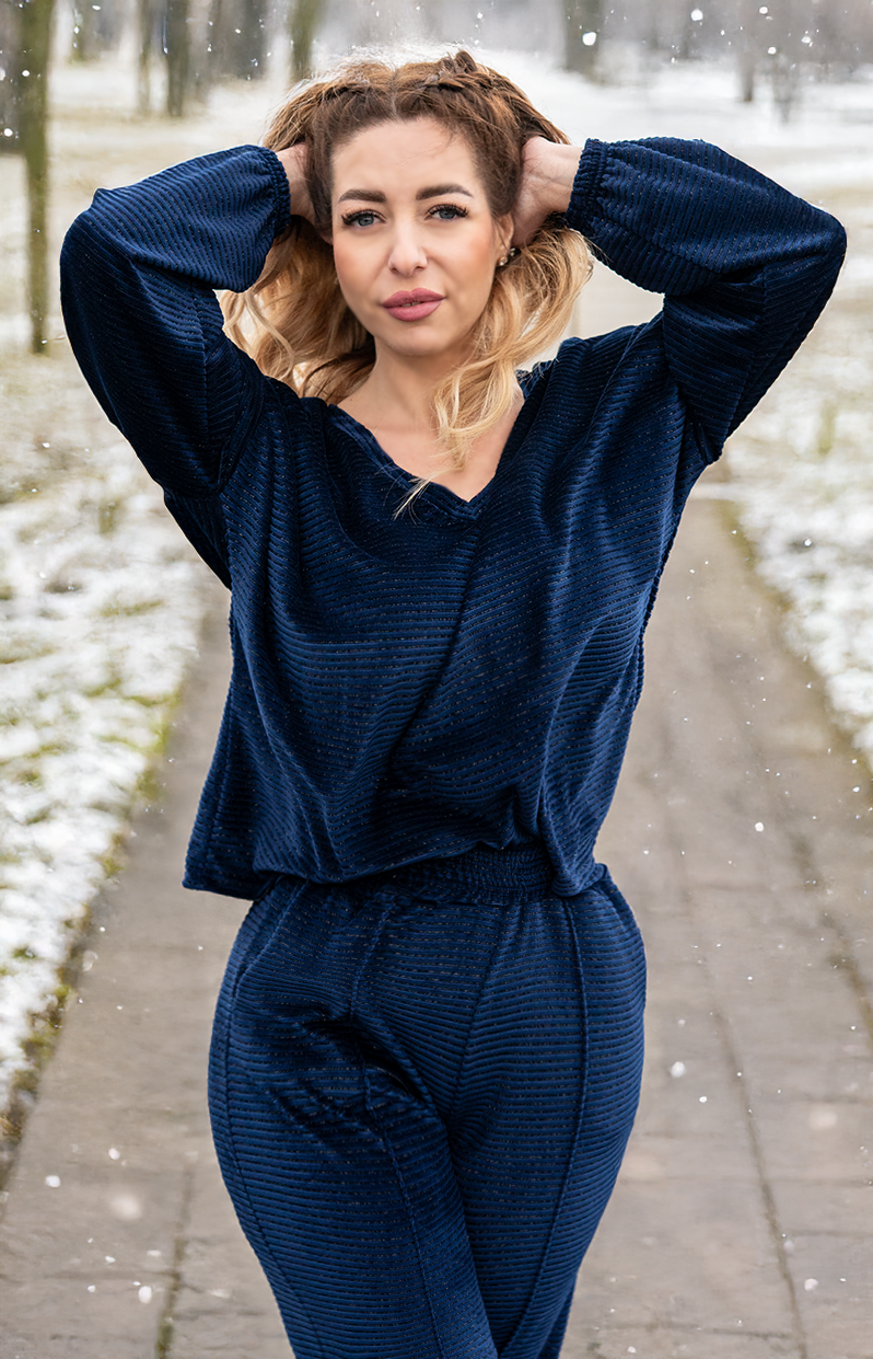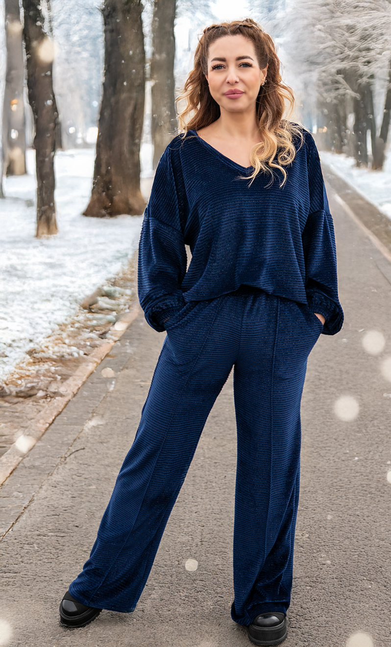 Bluza are o croială lejeră, cu decolteu în V, care pune subtil în valoare silueta și adaugă un aer elegant, fără a sacrifica confortul. Pantalonii cu talie elastică se așază natural pe corp, oferind libertate de mișcare și o purtare comodă pe tot parcursul zilei.