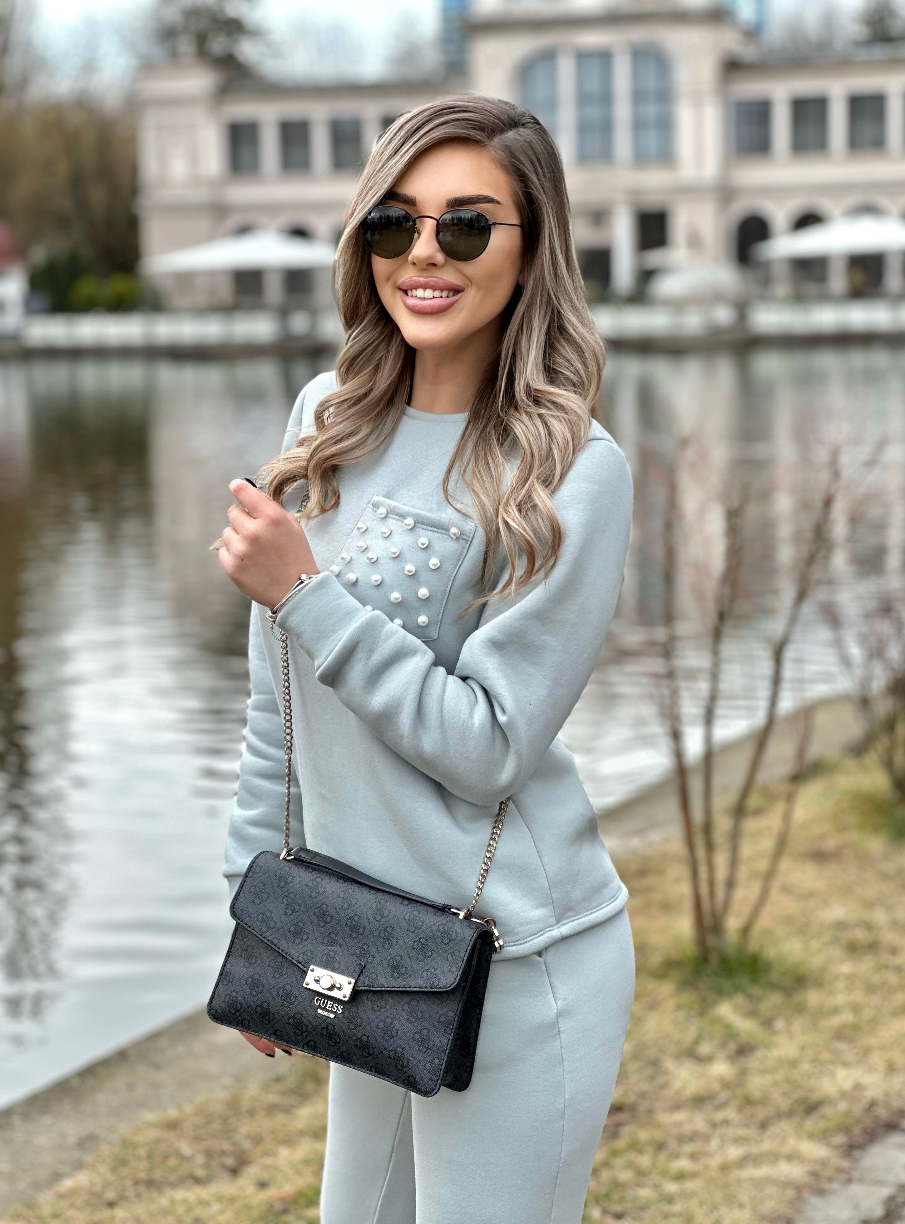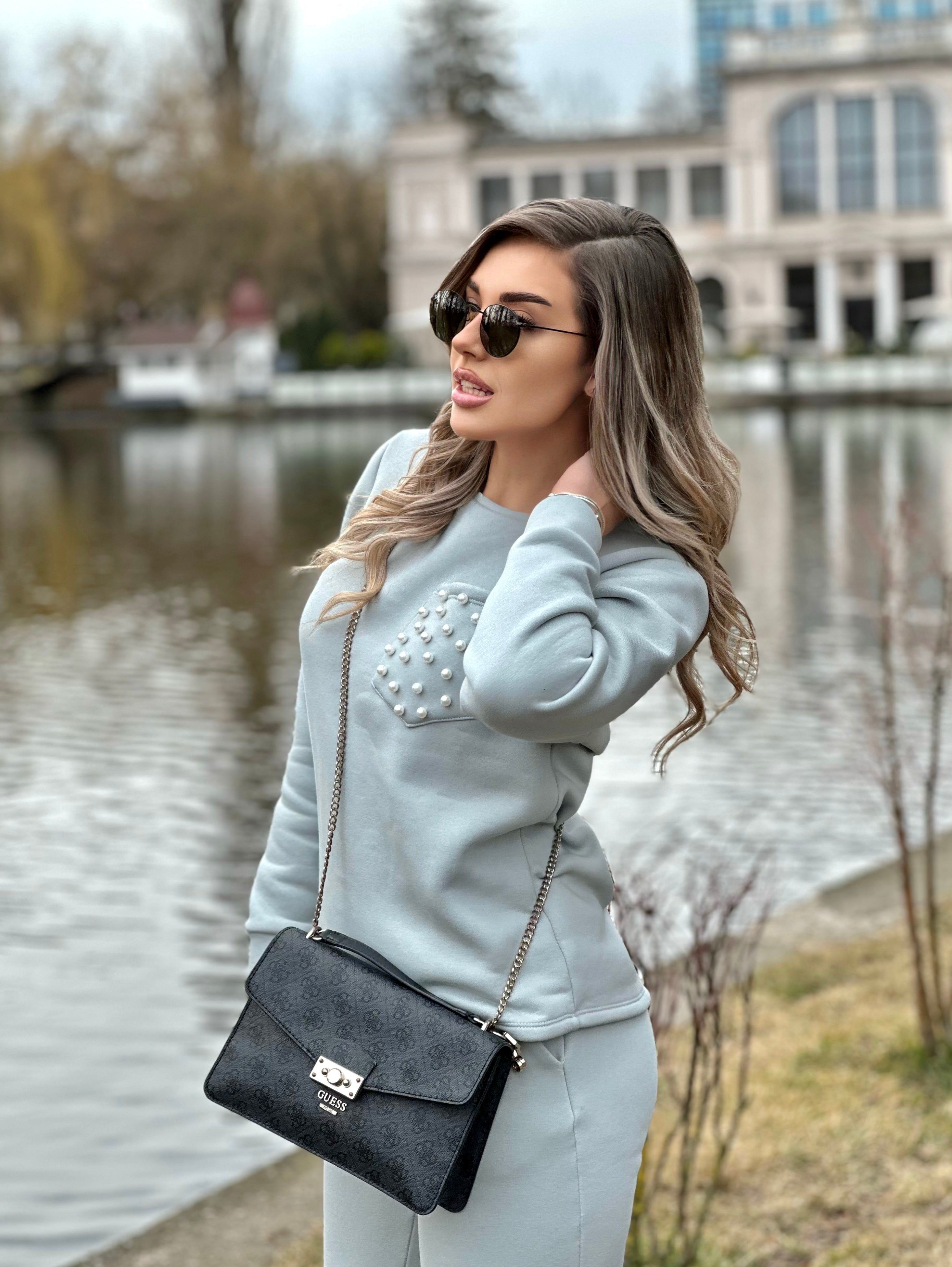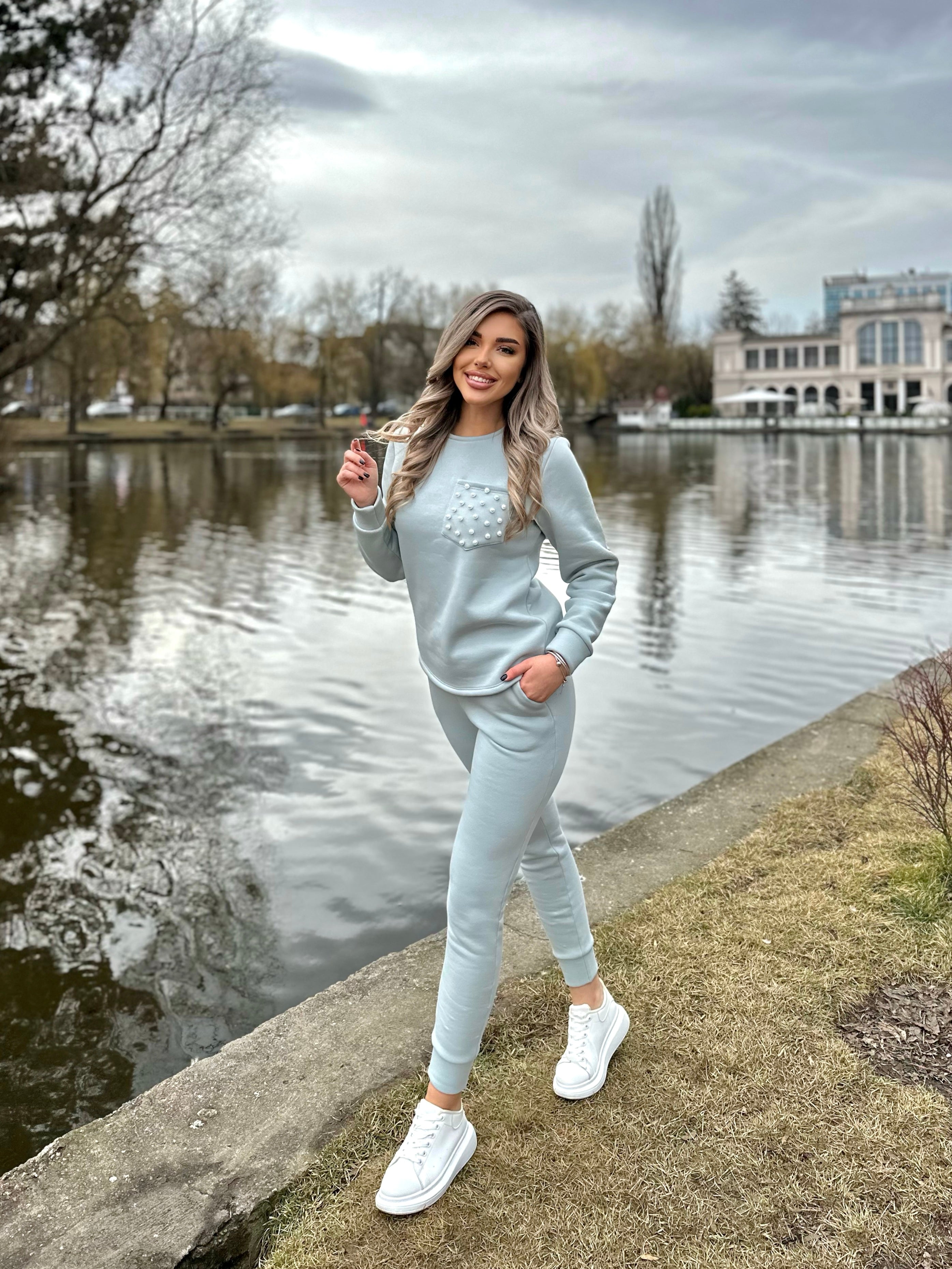 Trening Corina din doua piese, confectionat din bumbac plusat de calitate premium. Bluza lejera, accesorizata cu un buzunar ce este accesorizat cu multe perle foarte chic.