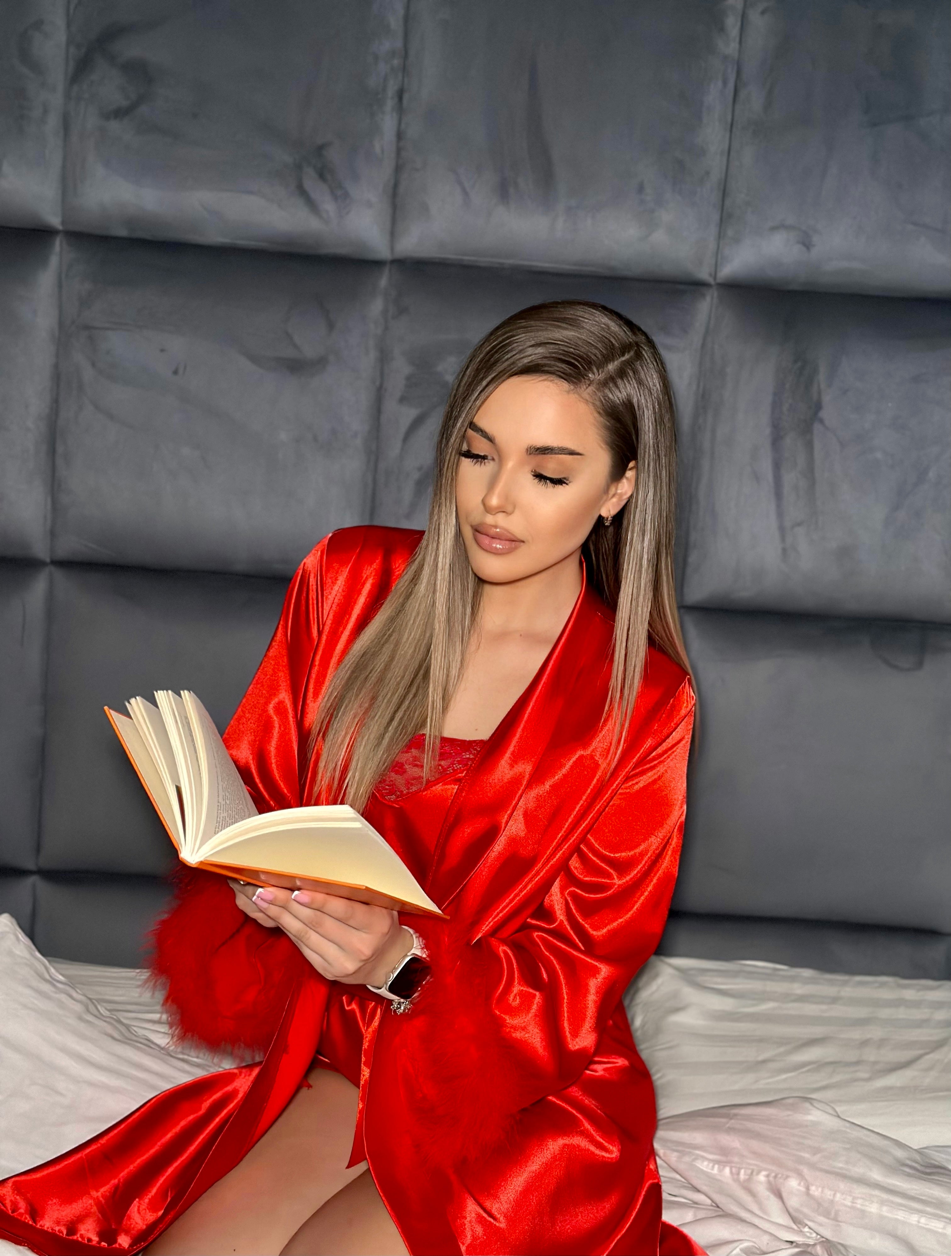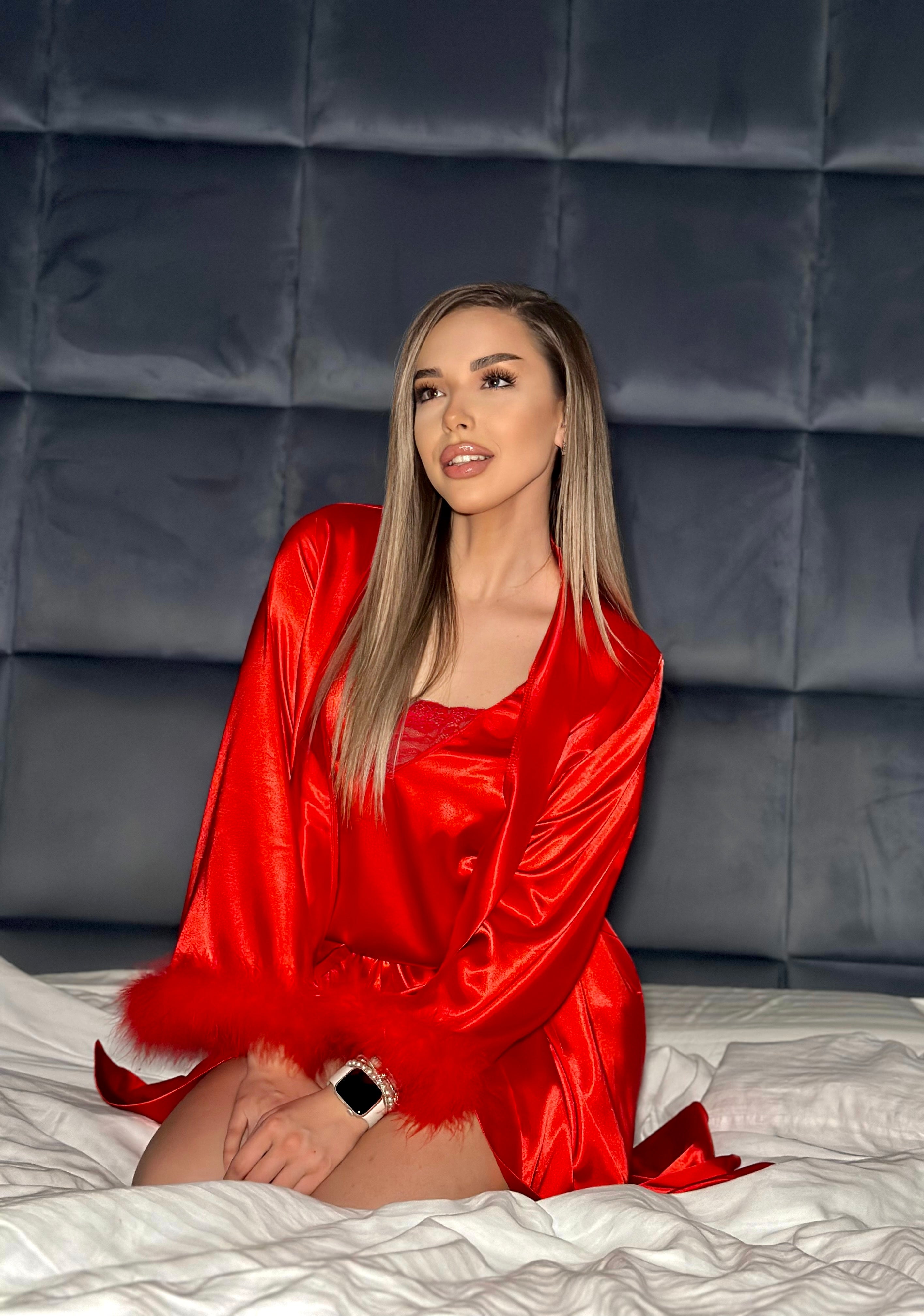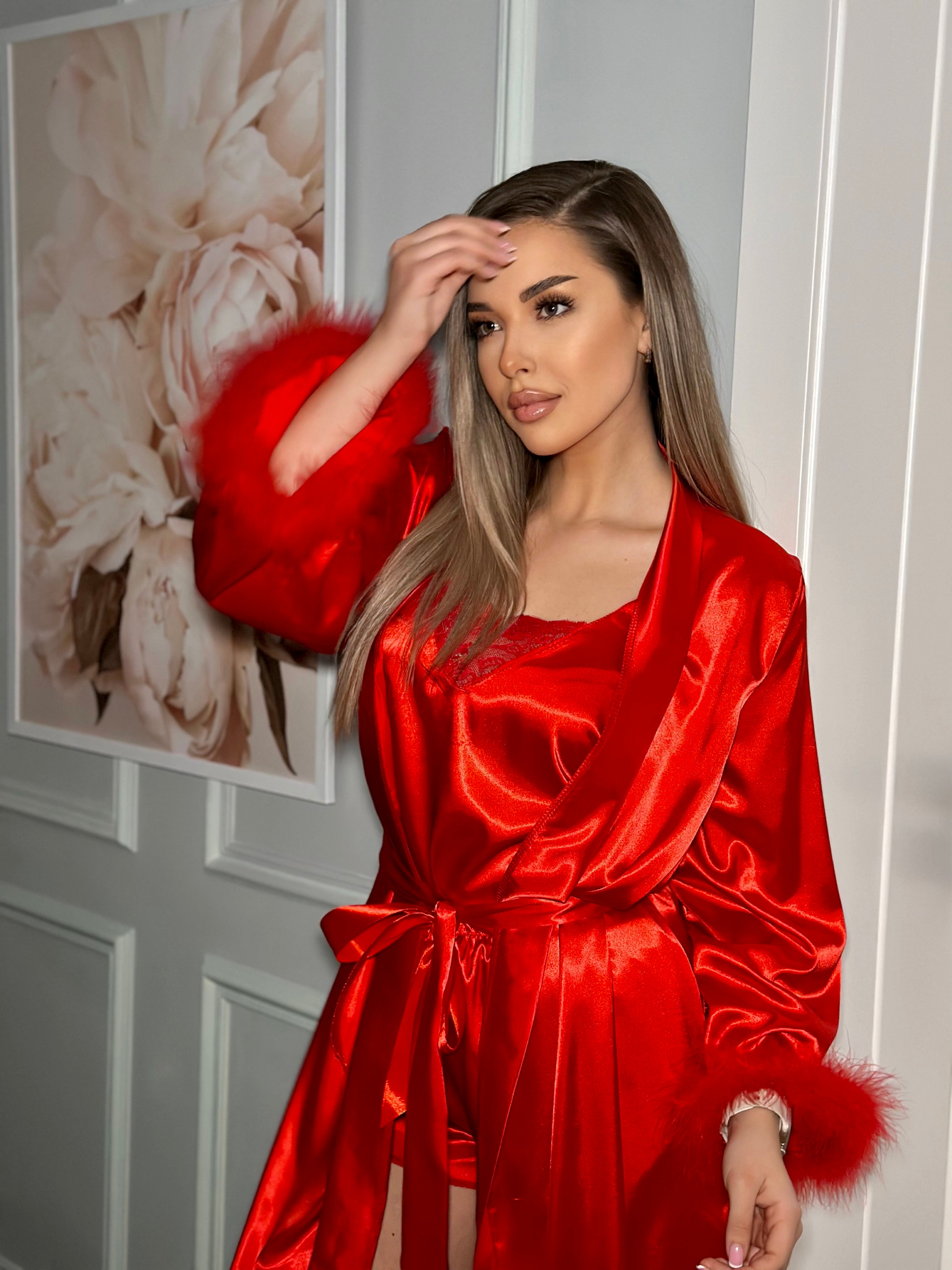 Compleu de noapte compus din 3 piese, realizat din saten elastic de calitate premium. Top cu bretele subtiri, pantalon scurt si halat. Pijamaua este accesorizata cu dantela infrumusetata pe partea frontala.